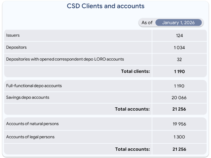 CSD clients and accounts, securities issues under the centralized custody as of January 1, 2026 Details